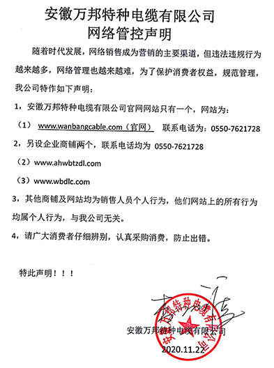 鄭重聲明:安徽萬邦特種電纜有限公司官方網站為:www_wanbangcable_com.bdqihua.cn,除此之外無任何子網站或合作網站,其余均為假冒偽劣。電話:0550-7621728 13485756353 地 址:安徽省天長市滁州高新技術產業開發區經四路29號